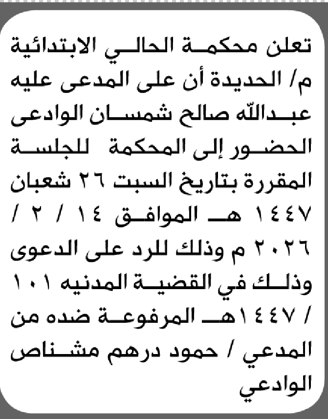 تعلن محكمة الحالي م/الحديده أن على المدعي عليه عبدالله الوادعي الحضور الى المحكمة إعلاناتمحاكم On يناير 30, 2026 Share Share FacebookTwitterWhatsAppTelegramGoogle+البريد الإلكترونيPrint
