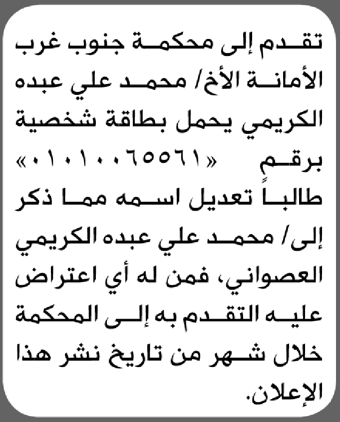 تعلن محكمة جنوب غرب الأمانة بأن الأخ/ محمد علي الكريمي تقدم إليها بطلب تعديل اسمه إعلاناتمحاكم On يناير 30, 2026 Share Share FacebookTwitterWhatsAppTelegramGoogle+البريد الإلكترونيPrint