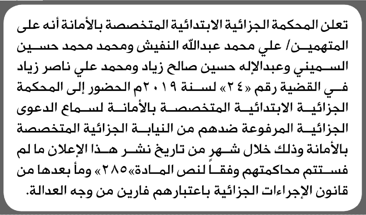 تعلن المحكمة الجزائية الابتدائية بأن على/ علي محمد النفيش وآخرين الحضور إلى المحكمة إعلاناتمحاكم On يناير 30, 2026 Share Share FacebookTwitterWhatsAppTelegramGoogle+البريد الإلكترونيPrint