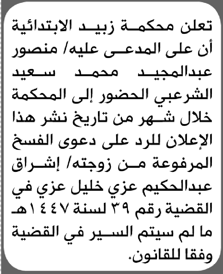 تعلن محمكة زبيد أن على المدعى عليه منصور الشرعبي الحضور الى المحكمة إعلاناتمحاكم On يناير 31, 2026 Share Share FacebookTwitterWhatsAppTelegramGoogle+البريد الإلكترونيPrint