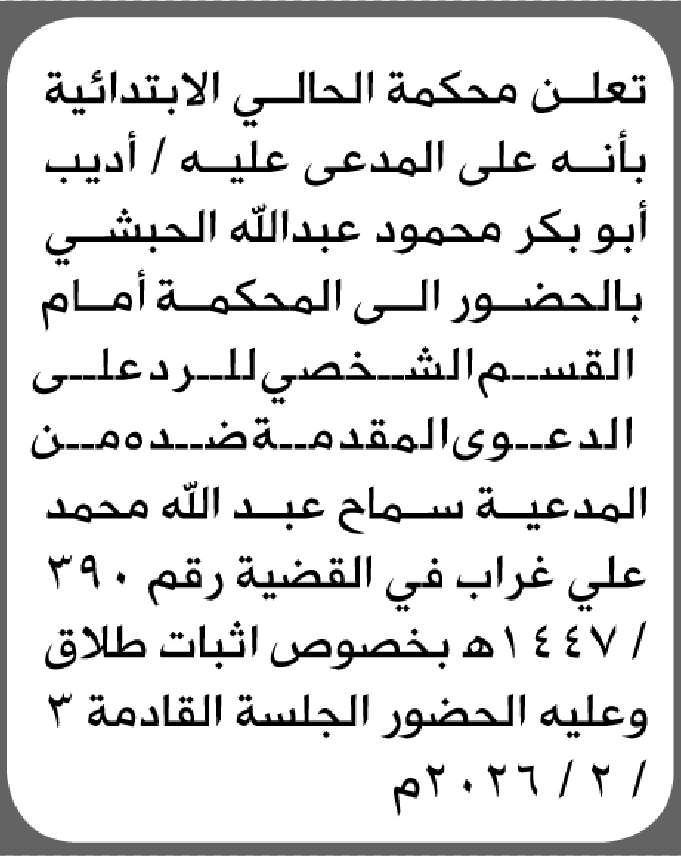 تعلن محكمة الحالي الابتدائية بأن على/ أديب ابوبكر الحبشي الحضور إلى المحكمة إعلاناتمحاكم On فبراير 1, 2026 Share Share FacebookTwitterWhatsAppTelegramGoogle+البريد الإلكترونيPrint