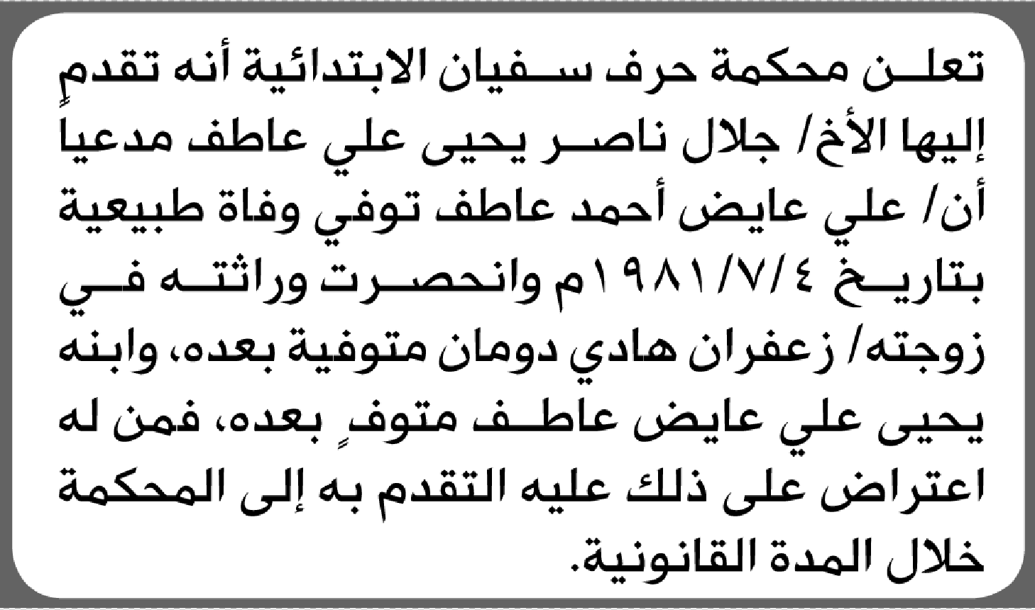 تعلن محكمة حرف سفيان الابتدائية بأن الأخ/ جلال ناصر عاطف تقدم إليها بطلب انحصار وراثة إعلاناتمحاكم On فبراير 1, 2026 Share Share FacebookTwitterWhatsAppTelegramGoogle+البريد الإلكترونيPrint