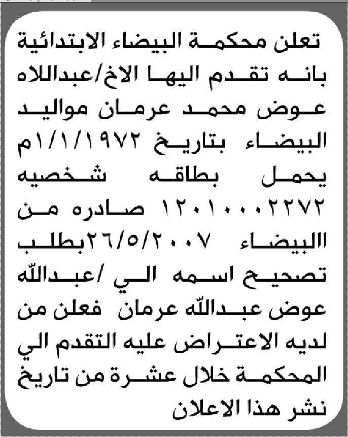 تعلن محكمة البيضاء الابتدائية بأن الأخ/ عبدالله عوض عرمان تقدم إليها بطلب تصحيح اسمه إعلاناتمحاكم On فبراير 1, 2026 Share Share FacebookTwitterWhatsAppTelegramGoogle+البريد الإلكترونيPrint