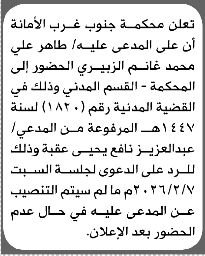 تعلن محكمة جنوب غرب الأمانة أن على المدعى عليه طاهر الزبيري الحضور إلى المحكمة إعلاناتمحاكم On فبراير 2, 2026 Share Share FacebookTwitterWhatsAppTelegramGoogle+البريد الإلكترونيPrint