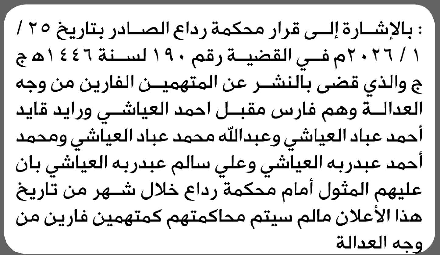 تعلن محكمة رداع أن على المتهمين فارس العياشي وآخرين الحضور إلى المحكمة إعلاناتمحاكم On فبراير 2, 2026 Share Share FacebookTwitterWhatsAppTelegramGoogle+البريد الإلكترونيPrint