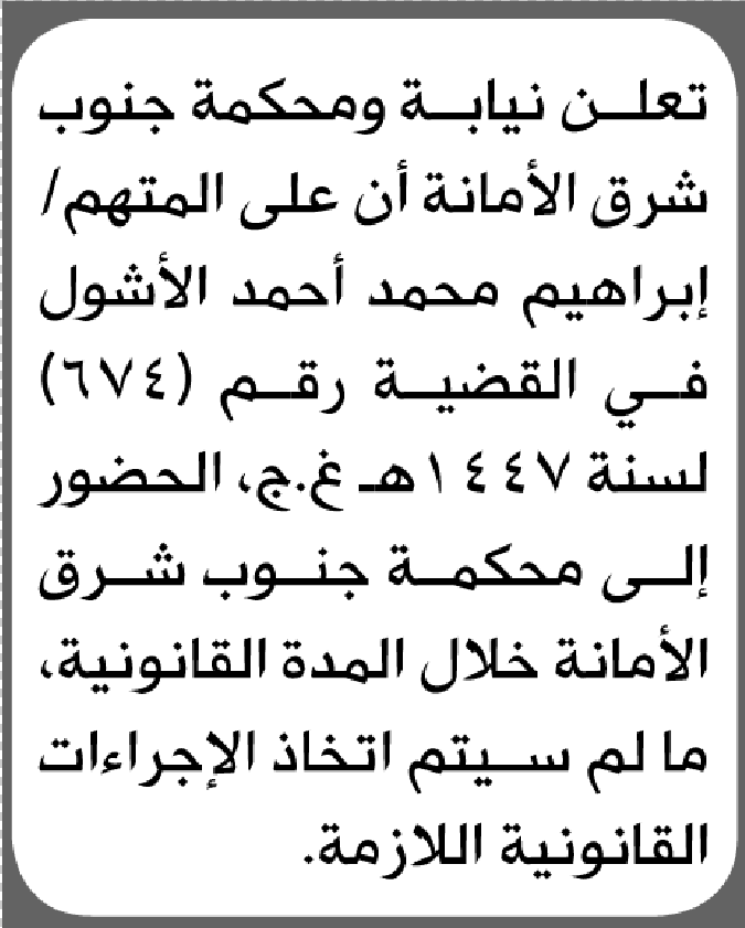 تعلن نيابة ومحكمة جنوب شرق أن على المتهم إبراهيم الأشول الحضور إلى المحكمة إعلاناتمحاكم On فبراير 2, 2026 Share Share FacebookTwitterWhatsAppTelegramGoogle+البريد الإلكترونيPrint