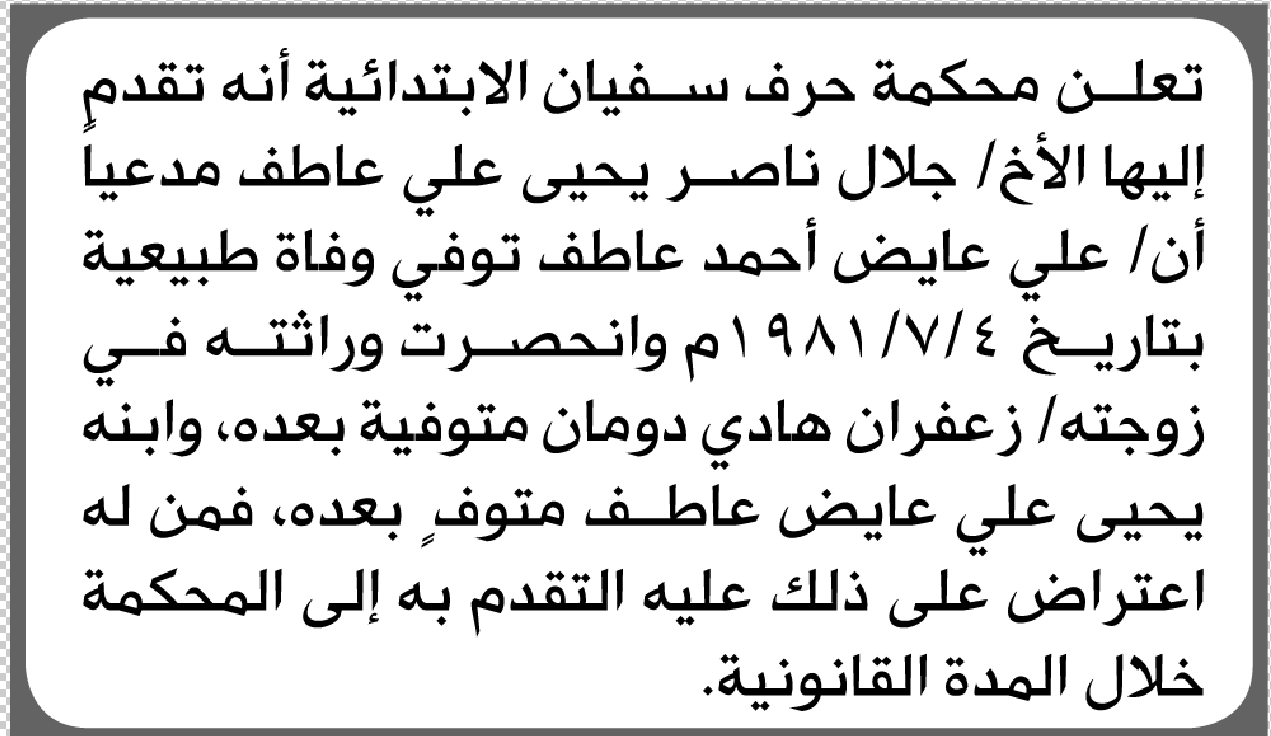 تعلن محكمة حرف سفيان الابتدائية بأن الأخ/ جلال ناصر عاطف تقدم إليها بطلب انحصار وراثة إعلاناتمحاكم On فبراير 2, 2026 Share Share FacebookTwitterWhatsAppTelegramGoogle+البريد الإلكترونيPrint
