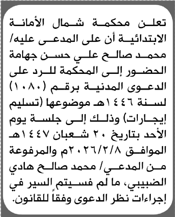تعلن محكمة شمال الأمانة بأن على/ محمد صالح جهامة الحضور إلى المحكمة إعلاناتمحاكم On فبراير 2, 2026 Share Share FacebookTwitterWhatsAppTelegramGoogle+البريد الإلكترونيPrint