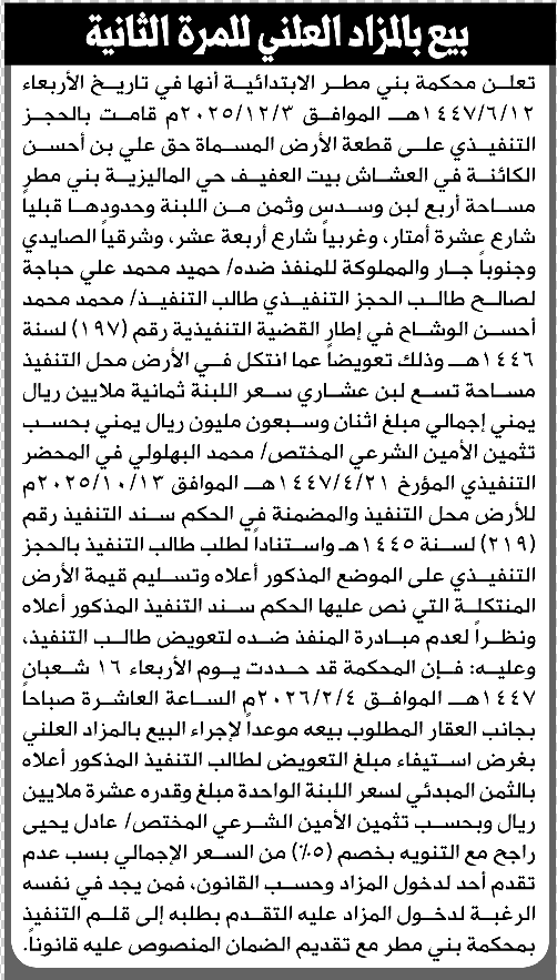 تعلن محكمة بني مطر الابتدائية عن بيع بالمزاد العلني لعقار المنفذ ضده/ حميد محمد حباجة إعلاناتمحاكم On فبراير 2, 2026 Share Share FacebookTwitterWhatsAppTelegramGoogle+البريد الإلكترونيPrint