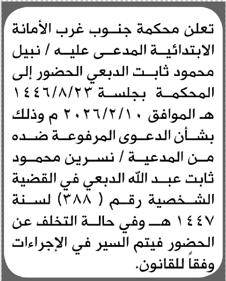 تعلن محكمة جنوب غرب الأمانة بأن على/ نبيل محمود الدبعي الحضور إلى المحكمة إعلاناتمحاكم On فبراير 2, 2026 Share Share FacebookTwitterWhatsAppTelegramGoogle+البريد الإلكترونيPrint