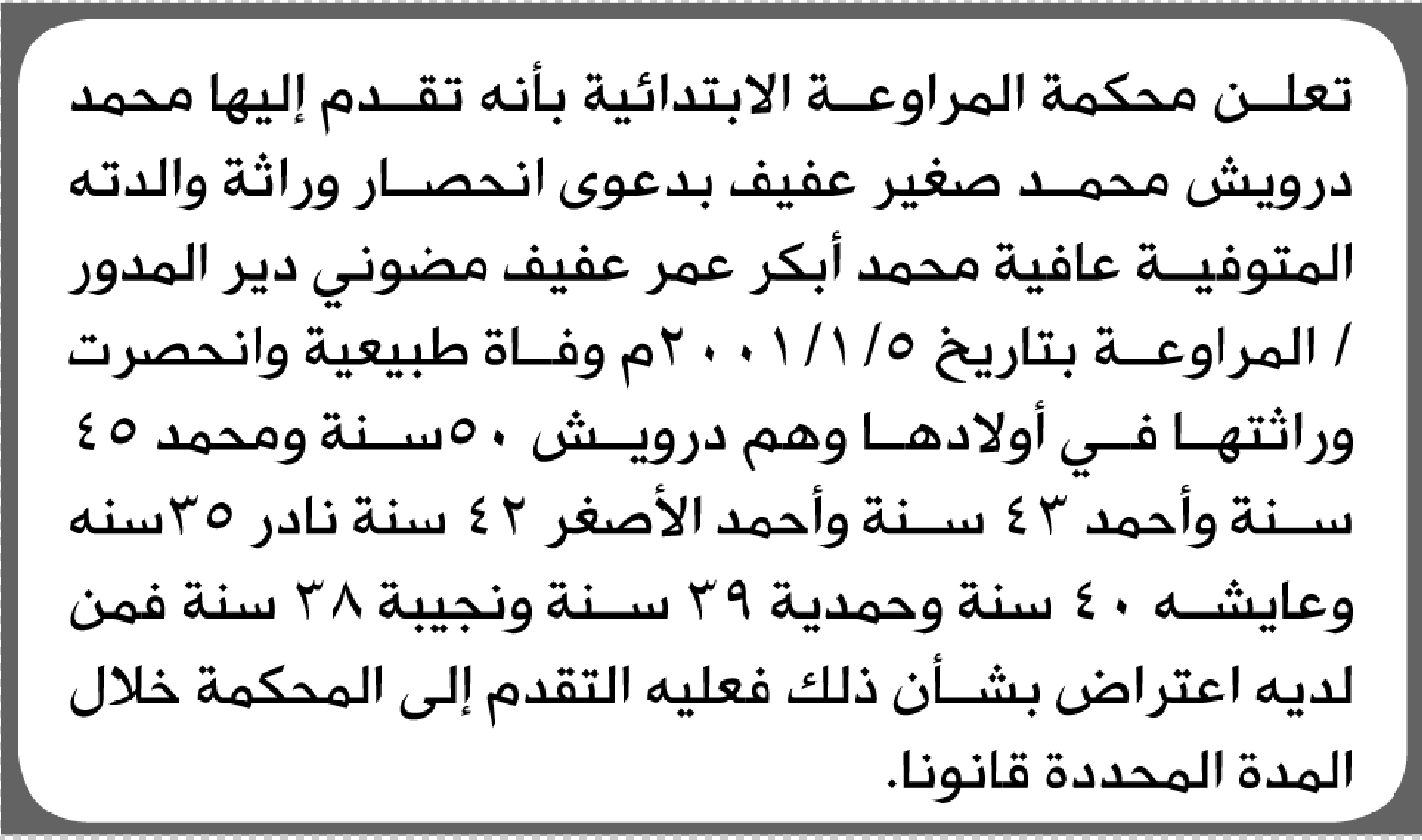 تعلن محكمة المراوعة أن الأخ محمد عفيف تقدم بدعوى انحصار وراثة إعلاناتمحاكم On فبراير 3, 2026 Share Share FacebookTwitterWhatsAppTelegramGoogle+البريد الإلكترونيPrint