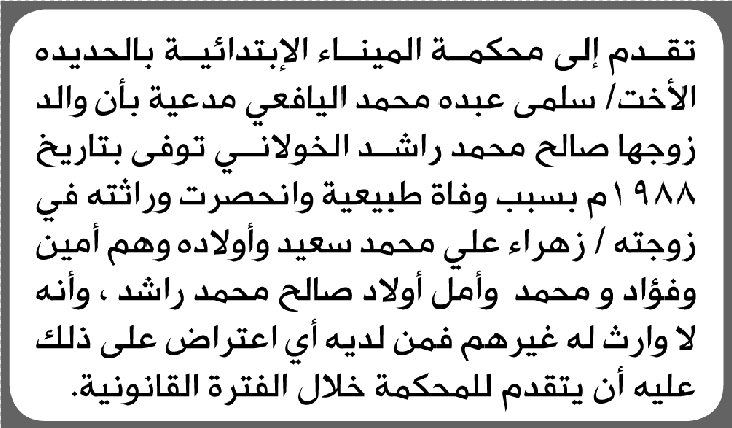 تعلن محكمة الميناء أن الأخت سلمى اليافعي تقدمت بدعوى انحصار وراثة إعلاناتمحاكم On فبراير 3, 2026 Share Share FacebookTwitterWhatsAppTelegramGoogle+البريد الإلكترونيPrint