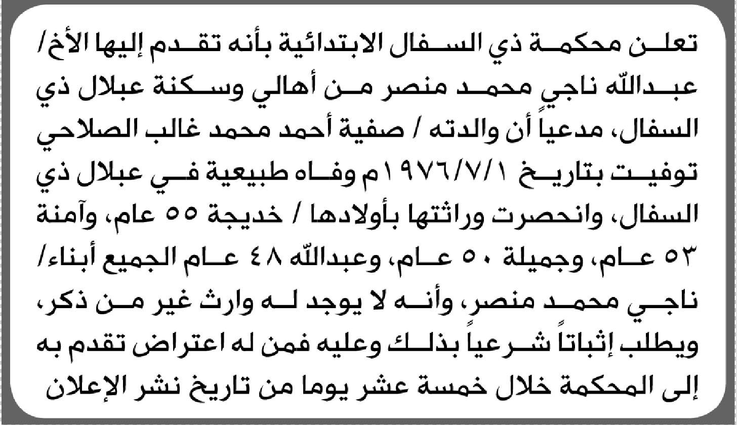 تعلن محكمة ذي السفال أن الأخ عبدالله منصر تقدم بدعوى انحصار وراثة إعلاناتمحاكم On فبراير 3, 2026 Share Share FacebookTwitterWhatsAppTelegramGoogle+البريد الإلكترونيPrint