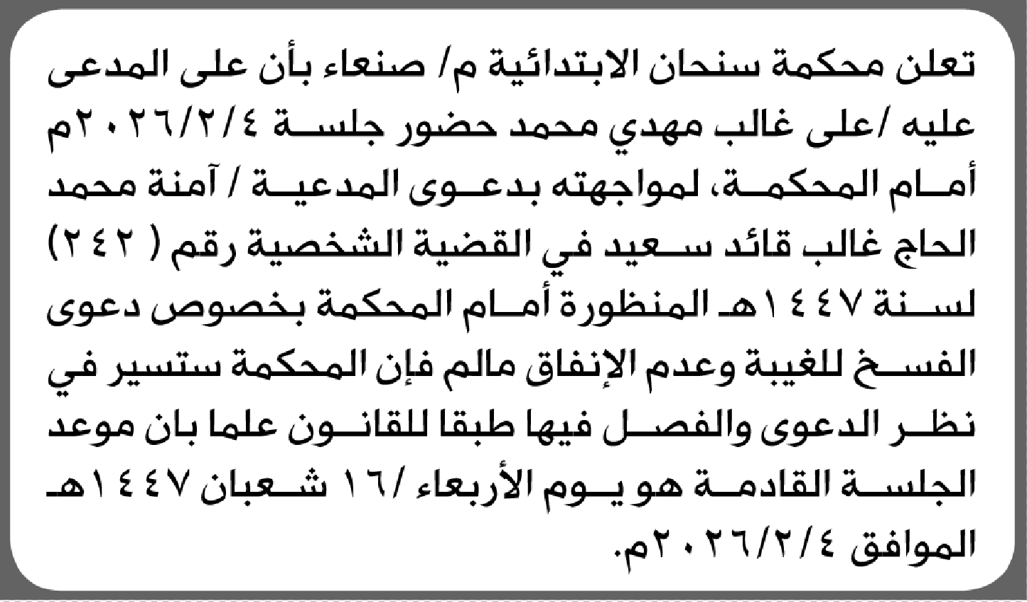 تعلن محكمة سنحان الابتدائية بأن على/ علي غالب محمد الحضور إلى المحكمة إعلاناتمحاكم On فبراير 3, 2026 Share Share FacebookTwitterWhatsAppTelegramGoogle+البريد الإلكترونيPrint