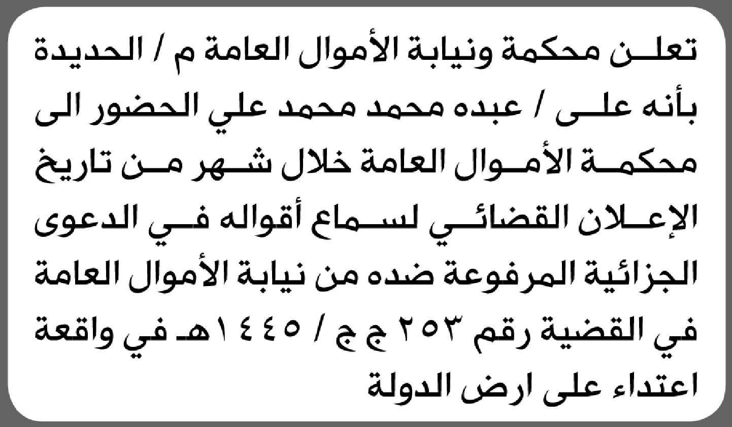تعلن محكمة م/الحديدة أن على المدعى عليه عبده علي الحضور الى المحكمة إعلاناتمحاكم On فبراير 3, 2026 Share Share FacebookTwitterWhatsAppTelegramGoogle+البريد الإلكترونيPrint