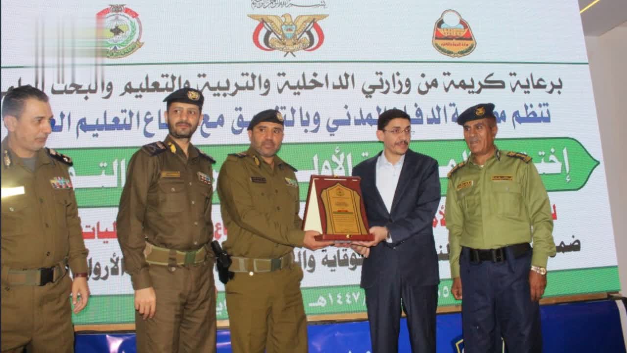 وفي ختام الحفل الذي حضره مديرا العلاقات والتوجيه بمصلحة الدفاع المدني العقيد خالد الشراحي، والأنشطة بقطاع التعليم العالي عبد الكريم الضحاك، كرمت مصلحة الدفاع المدني وزير التربية والتعليم والبحث العلمي والجامعات والكليات المستضيفة والمشاركة في البرنامج التوعوي بدروع وشهادات تقدير.