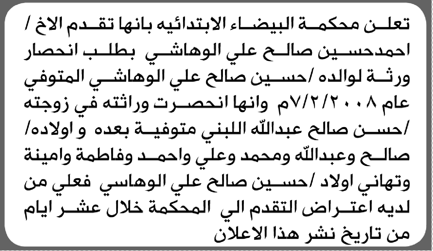 تعلن محكمة البيضاء الابتدائية بأن الأخ/ أحمد حسين الوشلي تقدم إليها بطلب انحصار وراثة إعلاناتمحاكم On فبراير 4, 2026 Share Share FacebookTwitterWhatsAppTelegramGoogle+البريد الإلكترونيPrint