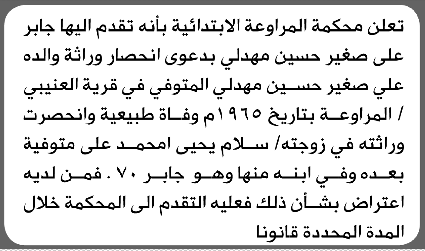 تعلن محكمة المراوعة الابتدائية بأن الأخ/ جابر علي مهدلي تقدم إليها بطلب انحصار وراثة إعلاناتمحاكم On فبراير 4, 2026 Share Share FacebookTwitterWhatsAppTelegramGoogle+البريد الإلكترونيPrint