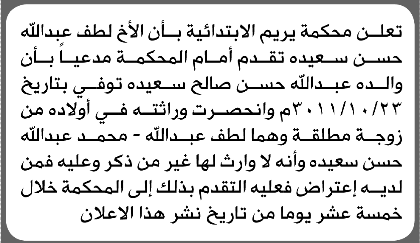 تعلن محكمة يريم الابتدائية بأن الأخ/ لطف عبدالله سعيده تقدم إليها بطلب انحصار وراثة إعلاناتمحاكم On فبراير 4, 2026 Share Share FacebookTwitterWhatsAppTelegramGoogle+البريد الإلكترونيPrint
