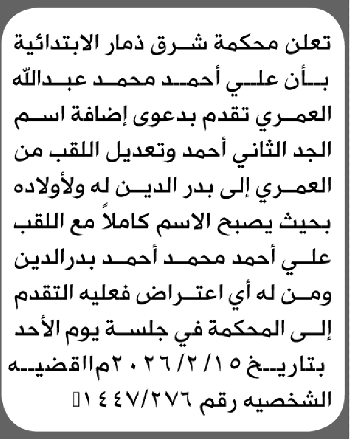 تعلن محكمة شرق ذمار الابتدائية بأن الأخ/ علي أحمد العمري تقدم إليها بطلب إضافة اللقب إعلاناتمحاكم On فبراير 5, 2026 Share Share FacebookTwitterWhatsAppTelegramGoogle+البريد الإلكترونيPrint