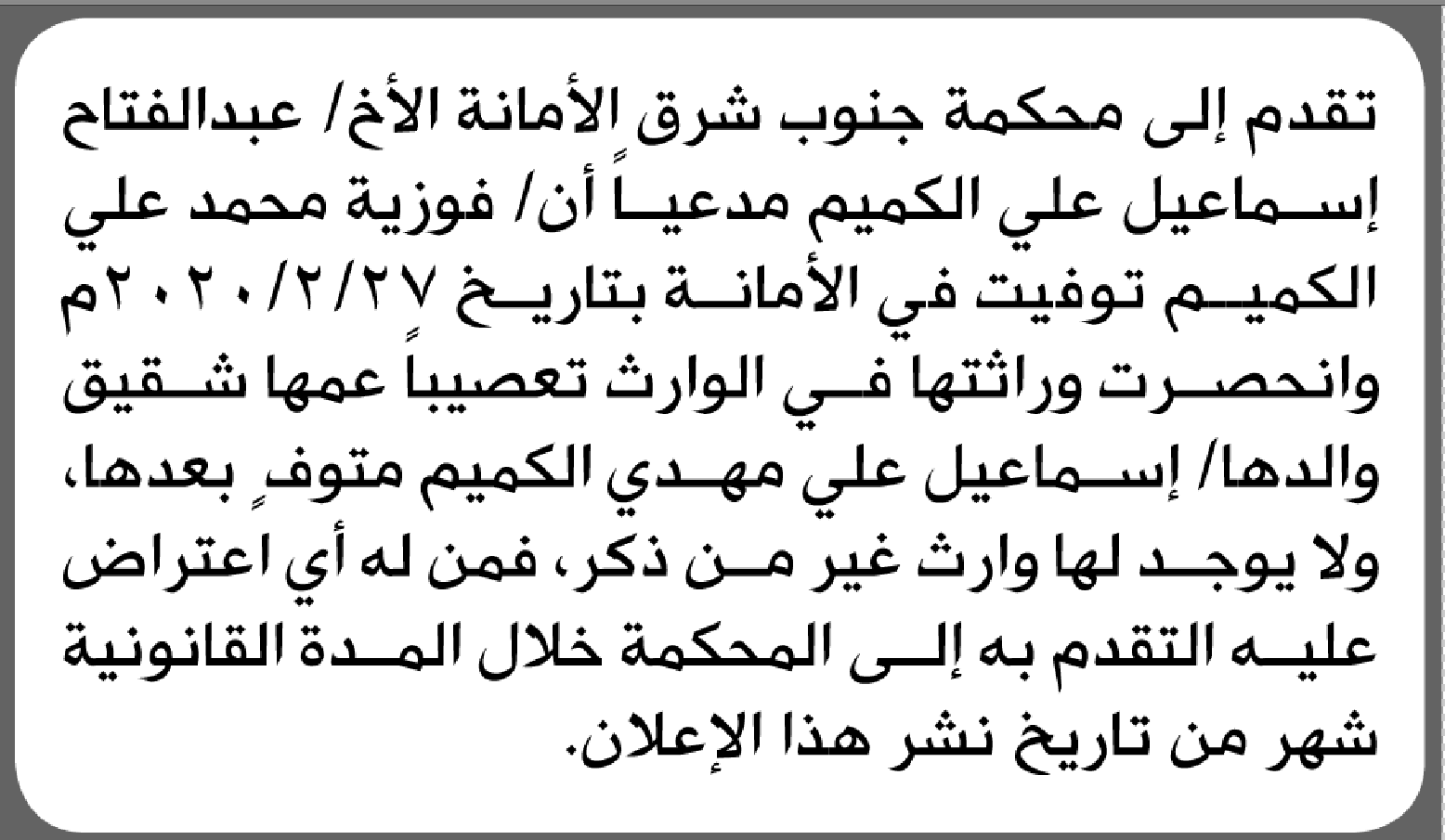 تعلن محكمة جنوب شرق الأمانة بأن الأخ/ عبدالفتاح إسماعيل الكميم تقدم إليها بطلب انحصار وراثة إعلاناتمحاكم On فبراير 5, 2026 Share Share FacebookTwitterWhatsAppTelegramGoogle+البريد الإلكترونيPrint