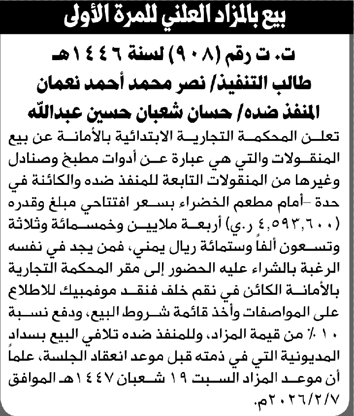 تعلن المحكمة التجارية بالأمانة عن بيع المنقولات التابعة للمنفذ ضده حسان شعبان إعلاناتمحاكم On فبراير 5, 2026 Share Share FacebookTwitterWhatsAppTelegramGoogle+البريد الإلكترونيPrint