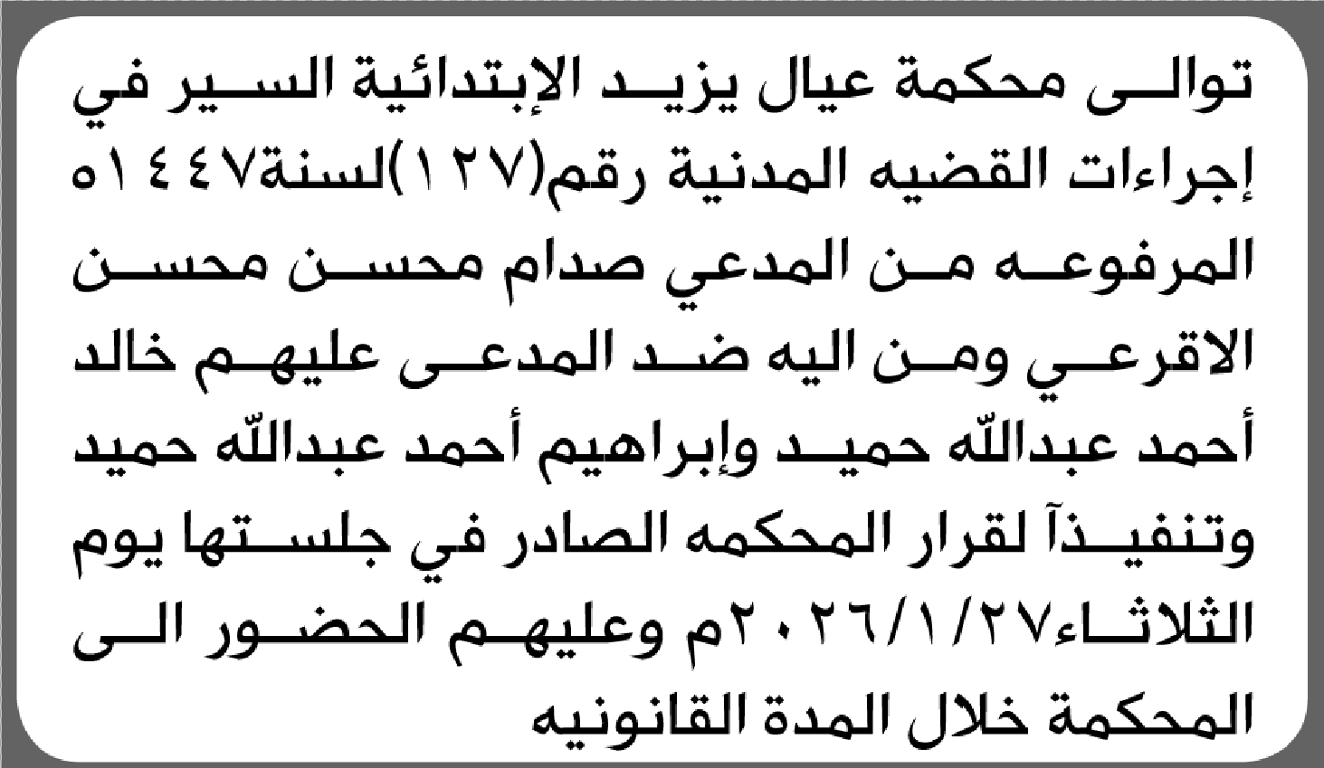 تعلن محكمة عيال يزيد الابتدائية بأن على/ خالد حميد وآخرين الحضور إلى المحكمة إعلاناتمحاكم On فبراير 7, 2026 Share Share FacebookTwitterWhatsAppTelegramGoogle+البريد الإلكترونيPrint