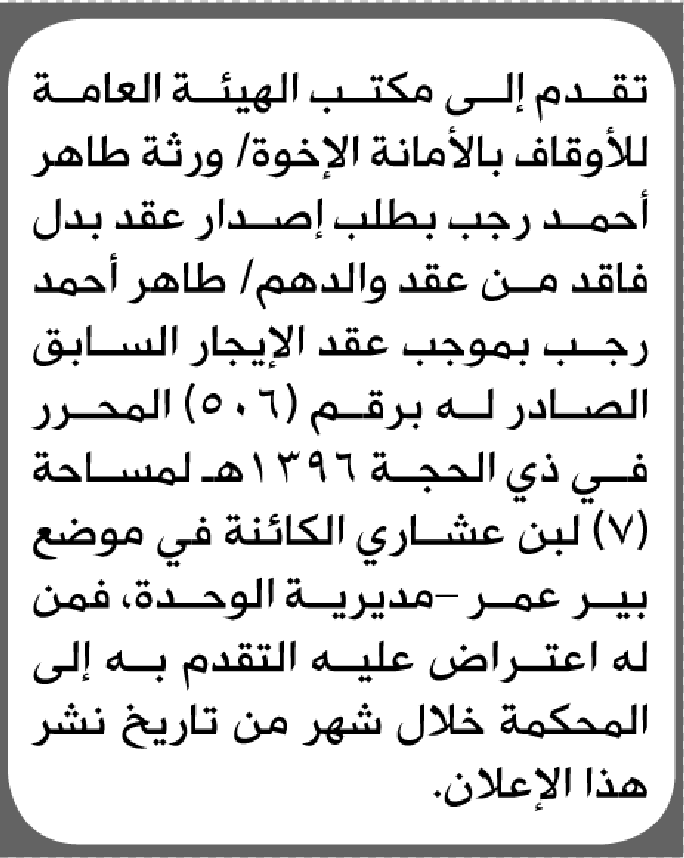 تعلن الهيئة العامة للأوقاف العامة بأن ورثة/ طاهر أحمد رجب تقدموا إليها بطلب اصدار عقد بدل فاقد إعلاناتالسجل العقاري On فبراير 7, 2026 Share Share FacebookTwitterWhatsAppTelegramGoogle+البريد الإلكترونيPrint