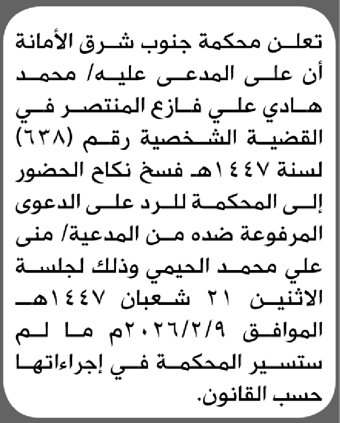 تعلن محكمة جنوب شرق الامانة بأن على/ محمد هادي المنتصر الحضور إلى المحكمة إعلاناتمحاكم On فبراير 7, 2026 Share Share FacebookTwitterWhatsAppTelegramGoogle+البريد الإلكترونيPrint
