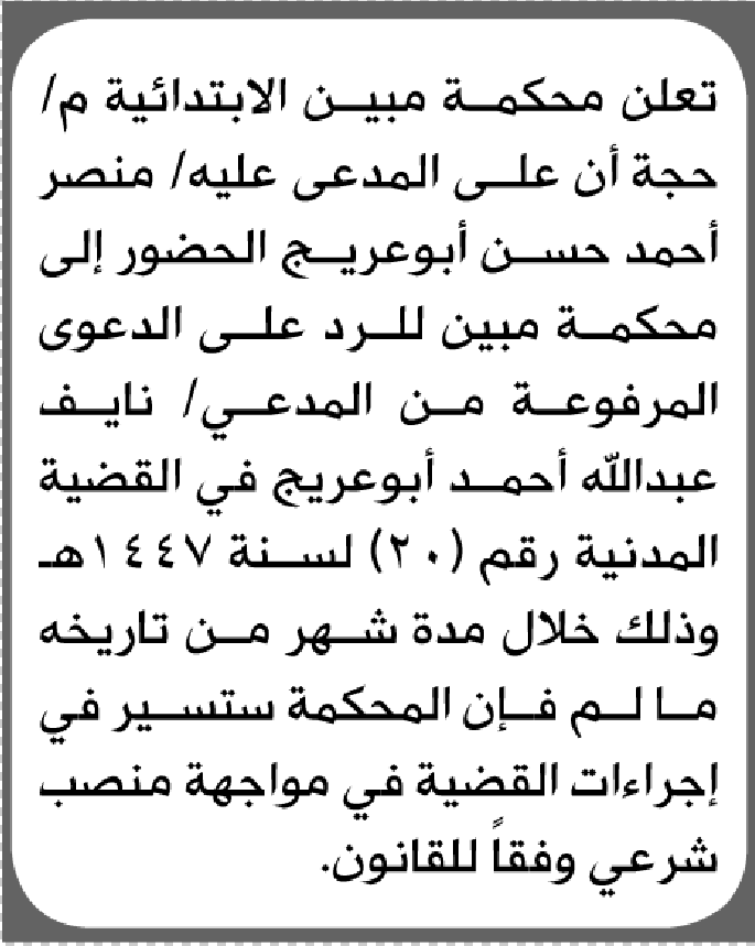 تعلن محكمة مبين الابتدائية بأن على/ منصر أحمد أبوعريج الحضور إلى المحكمة إعلاناتمحاكم On فبراير 7, 2026 Share Share FacebookTwitterWhatsAppTelegramGoogle+البريد الإلكترونيPrint