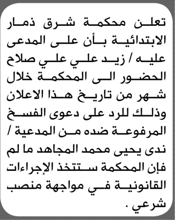 تعلن محكمة شرق ذمار الابتدائية بأن على/ زيد علي صلاح الحضور إلى المحكمة إعلاناتمحاكم On فبراير 8, 2026 Share Share FacebookTwitterWhatsAppTelegramGoogle+البريد الإلكترونيPrint