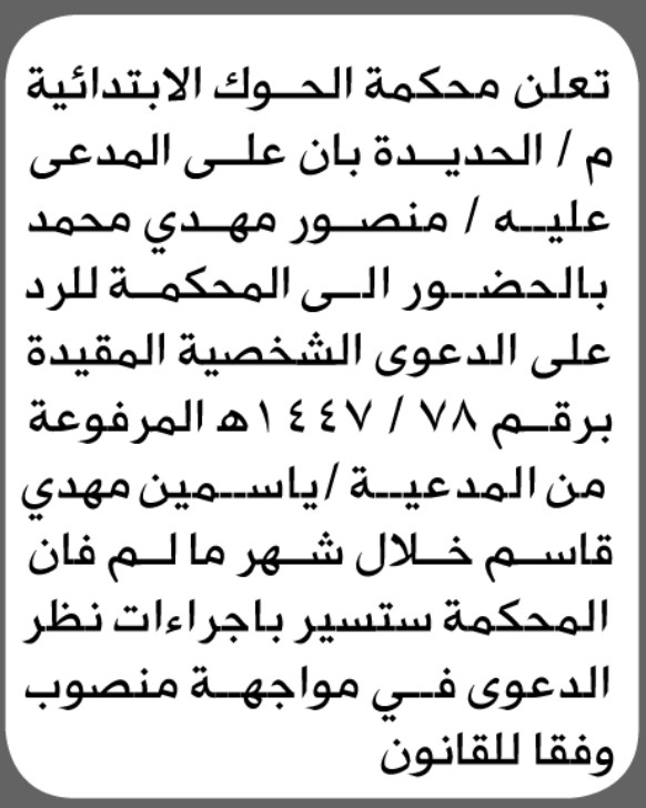 تعلن محكمة الحوك أن على المدعى عليه منصور مهدي الحضور إلى المحكمة إعلاناتمحاكم On فبراير 8, 2026 Share Share FacebookTwitterWhatsAppTelegramGoogle+البريد الإلكترونيPrint