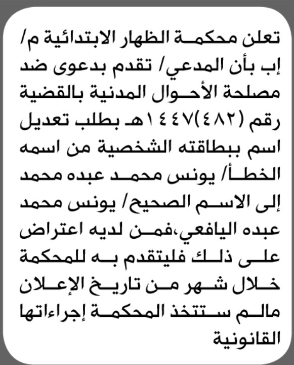 تعلن محكمة الظهار أن المدعي يونس محمد تقدم بطلب تصحيح اسمه إعلاناتمحاكم On فبراير 8, 2026 Share Share FacebookTwitterWhatsAppTelegramGoogle+البريد الإلكترونيPrint
