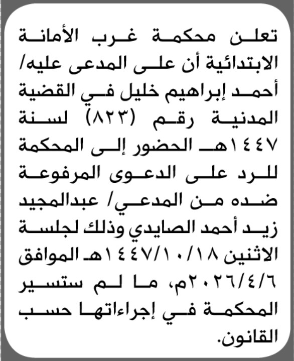تعلن محكمة غرب الأمانة أن على المدعى عليه أحمد خليل الحضور إلى المحكمة إعلاناتمحاكم On فبراير 8, 2026 Share Share FacebookTwitterWhatsAppTelegramGoogle+البريد الإلكترونيPrint