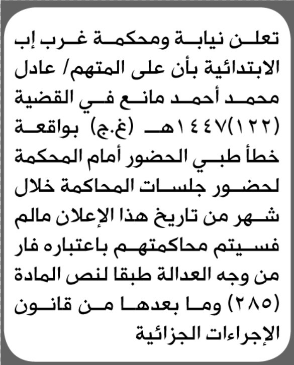 تعلن نيابة ومحكمة غرب إب أن على المتهم عادل مانع الحضور إلى المحكمة إعلاناتمحاكم On فبراير 8, 2026 Share Share FacebookTwitterWhatsAppTelegramGoogle+البريد الإلكترونيPrint