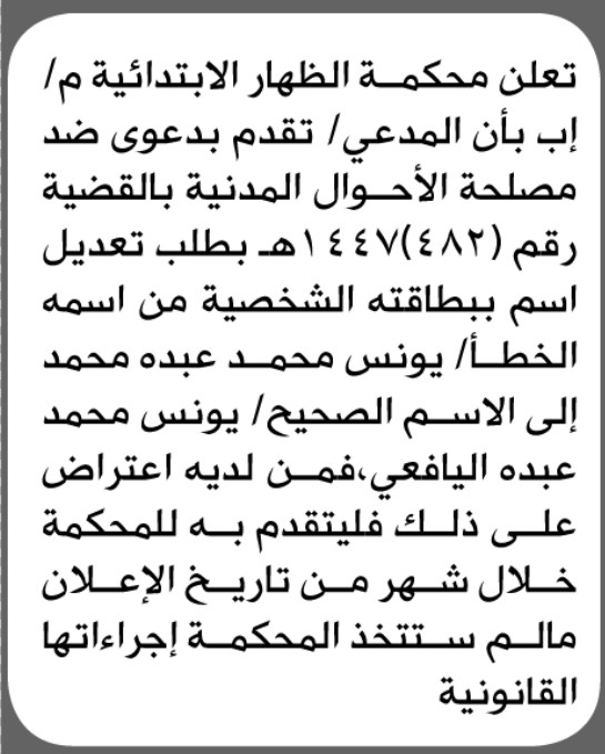 تعلن محكمة الظهار أن المدعي يونس محمد تقدم بطلب تصحيح اسمه إعلاناتمحاكم On فبراير 9, 2026 Share Share FacebookTwitterWhatsAppTelegramGoogle+البريد الإلكترونيPrint