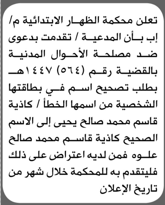 تعلن محكمة الظهار أن المدعية كاذية قاسم تقدمت بطلب تصحيح اسمها إعلاناتمحاكم On فبراير 9, 2026 Share Share FacebookTwitterWhatsAppTelegramGoogle+البريد الإلكترونيPrint
