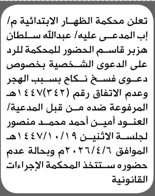 تعلن محكمة الظهار أن على المدعى عليه عبدالله هزبر الحضور إلى المحكمة إعلاناتمحاكم On فبراير 9, 2026 Share Share FacebookTwitterWhatsAppTelegramGoogle+البريد الإلكترونيPrint