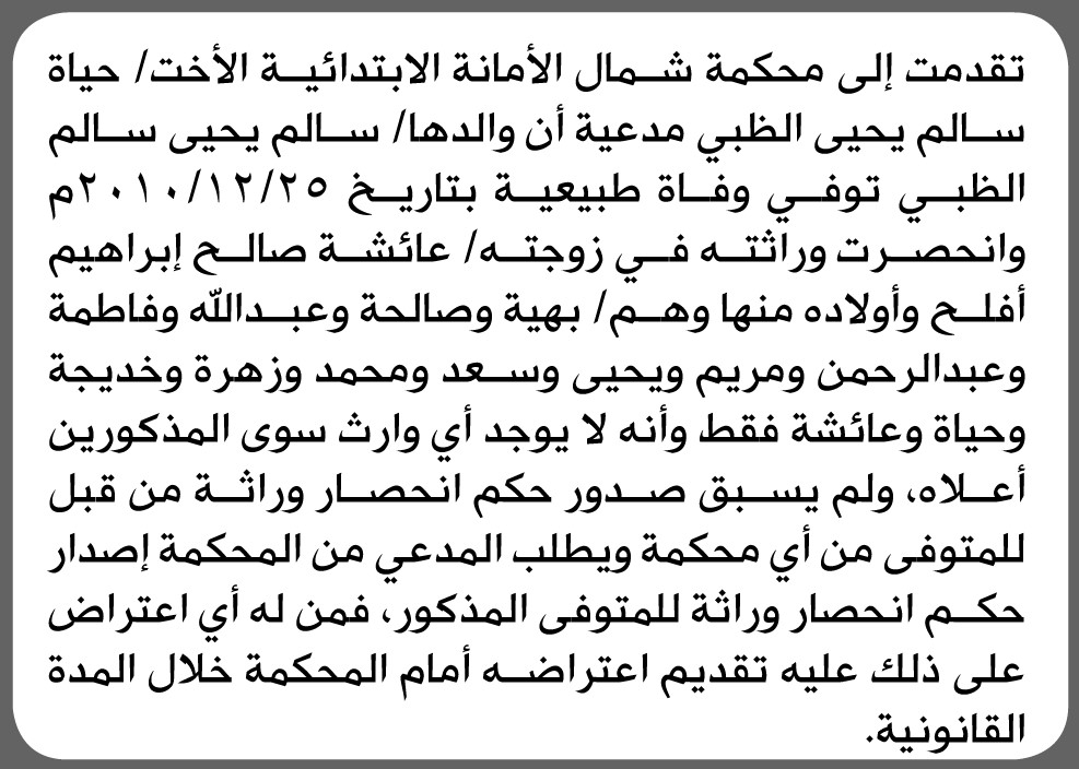 تعلن محكمة شمال الأمانة أن الأخت حياة الظبي تقدمت بدعوى انحصار وراثة إعلاناتمحاكم On فبراير 9, 2026 Share Share FacebookTwitterWhatsAppTelegramGoogle+البريد الإلكترونيPrint