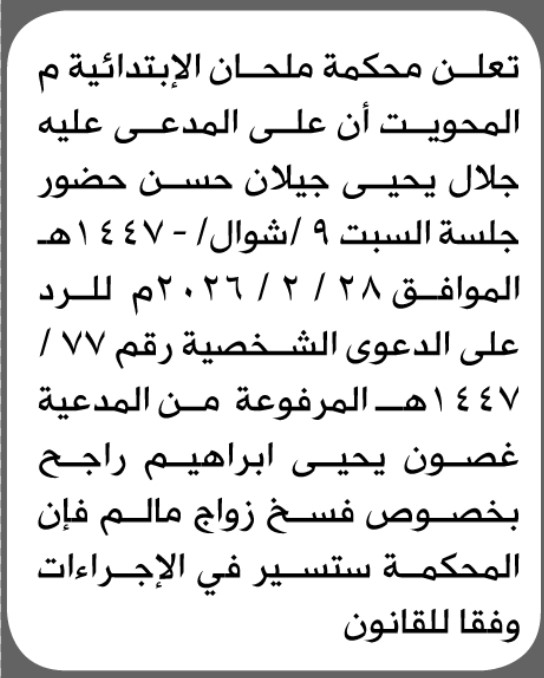 تعلن محكمة ملحان أن على المدعى عليه جلال يحيى جيلان الحضور إلى المحكمة إعلاناتمحاكم On فبراير 9, 2026 Share Share FacebookTwitterWhatsAppTelegramGoogle+البريد الإلكترونيPrint
