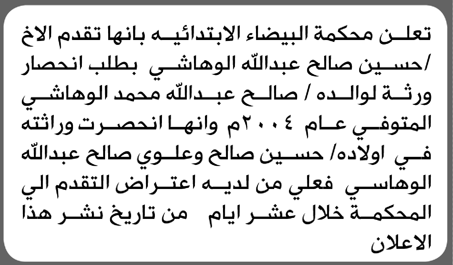 تعلن محكمة البيضاء أن الأخ حسين الوهاشي تقدم بدعوى انحصار وراثة إعلاناتمحاكم On فبراير 10, 2026 Share Share FacebookTwitterWhatsAppTelegramGoogle+البريد الإلكترونيPrint