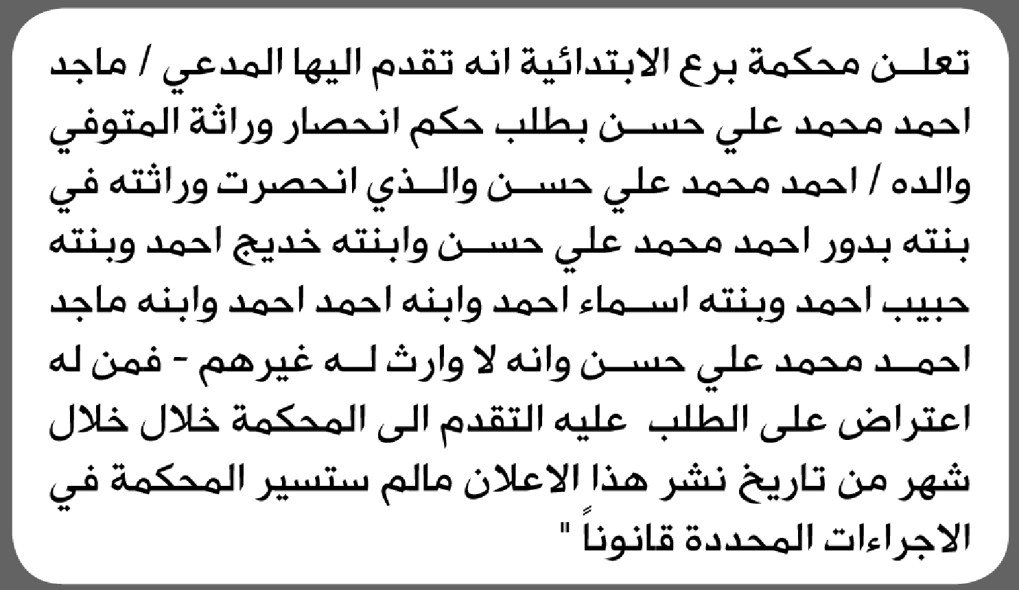 تعلن محكمة برع أن الأخ ماجد أحمد محمد تقدم بدعوى انحصار وراثة إعلاناتمحاكم On فبراير 10, 2026 Share Share FacebookTwitterWhatsAppTelegramGoogle+البريد الإلكترونيPrint