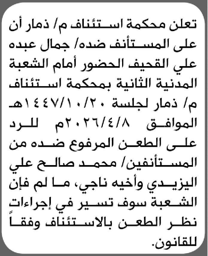 تعلن محكمة استئناف م/ذمار أن على المستأنف ضده جمال القحيف الحضور الى المحكمة إعلاناتمحاكم On فبراير 10, 2026 Share Share FacebookTwitterWhatsAppTelegramGoogle+البريد الإلكترونيPrint