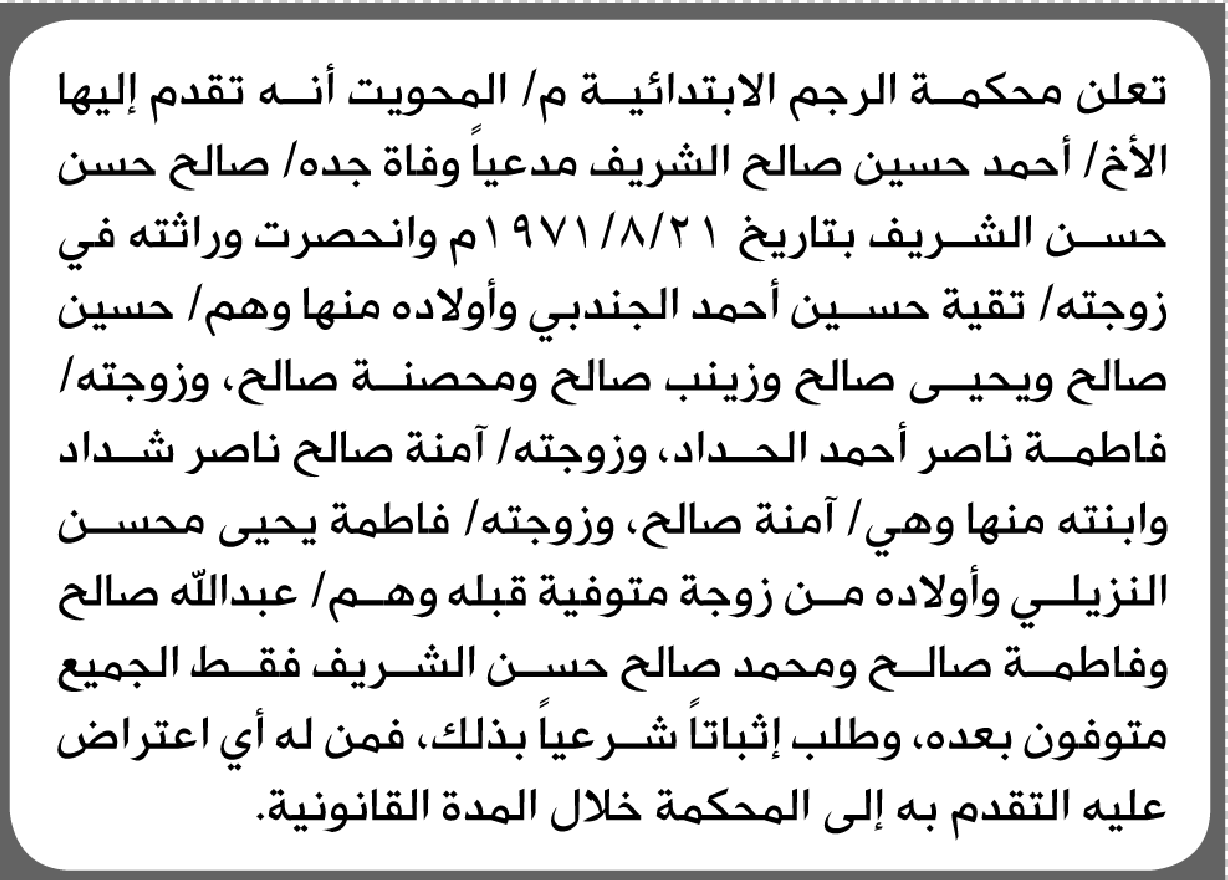 تعلن محكمة الرجم أن احمد الشريف تقدم بطلب انحصار وراثة إعلاناتمحاكم On فبراير 10, 2026 Share Share FacebookTwitterWhatsAppTelegramGoogle+البريد الإلكترونيPrint