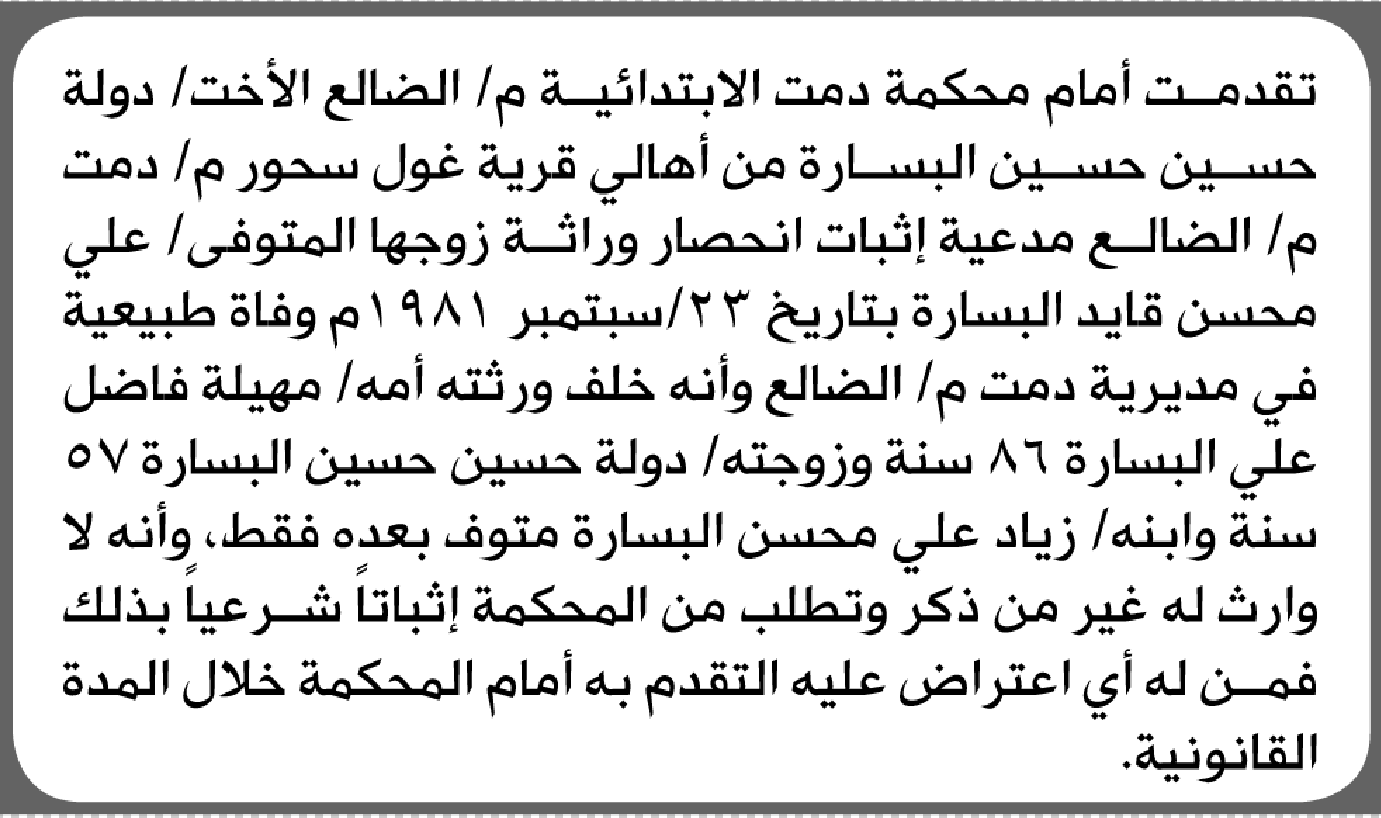 تعلن محكمة دمت أن الأخت دولة حسين البسارة تقدمت بدعوى انحصار وراثة إعلاناتمحاكم On فبراير 11, 2026 Share Share FacebookTwitterWhatsAppTelegramGoogle+البريد الإلكترونيPrint