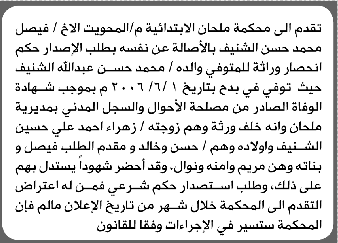تعلن محكمة ملحان أن الأخ فيصل محمد الشنيف تقدم بدعوى انحصار وراثة إعلاناتمحاكم On فبراير 11, 2026 Share Share FacebookTwitterWhatsAppTelegramGoogle+البريد الإلكترونيPrint