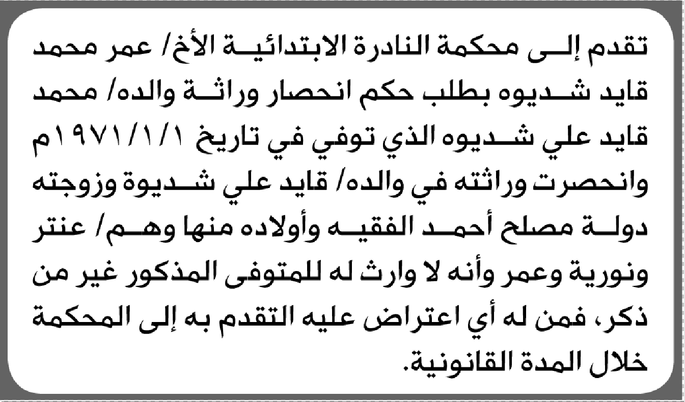 تعلن محكمة النادرة الابتدائية بأن الأخ/ عمر محمد شديوه تقدم إليها بطلب انحصار وراثة إعلاناتمحاكم On فبراير 12, 2026 Share Share FacebookTwitterWhatsAppTelegramGoogle+البريد الإلكترونيPrint