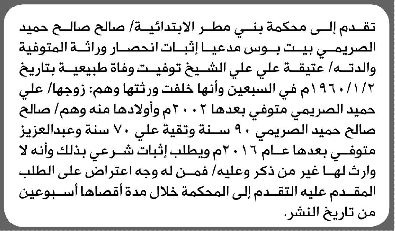 تعلن محكمة بني مطر الابتدائية بأن الأخ/ صالح حميد الصريمي تقدم إليها بطلب انحصار وراثة إعلاناتمحاكم On فبراير 12, 2026 Share Share FacebookTwitterWhatsAppTelegramGoogle+البريد الإلكترونيPrint