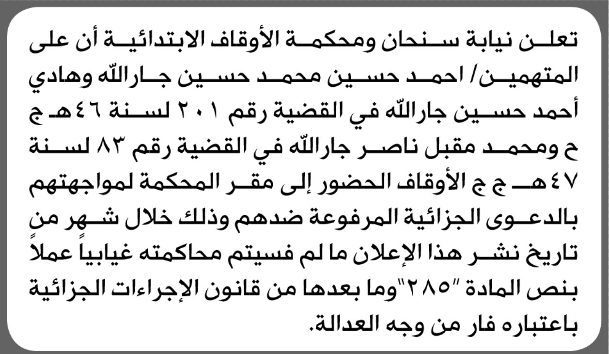 تعلن محكمة الأوقاف أن على المتهمين الحضور الى المحكمة إعلانات On فبراير 13, 2026 Share Share FacebookTwitterWhatsAppTelegramGoogle+البريد الإلكترونيPrint