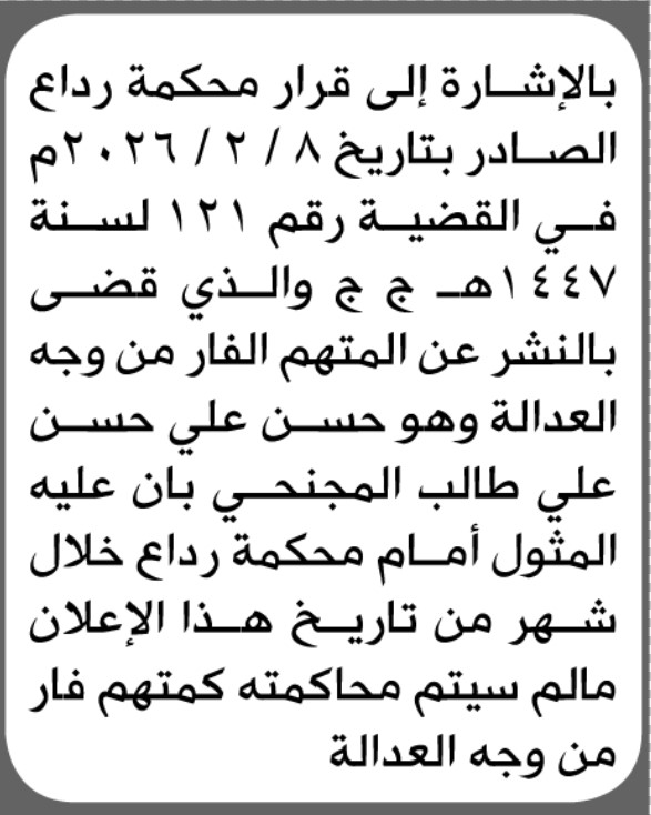 تعلن محكمة رداع أن على المتهم الفار حسن المجنحي المثول أمام المحكمة إعلاناتمحاكم On فبراير 13, 2026 Share Share FacebookTwitterWhatsAppTelegramGoogle+البريد الإلكترونيPrint
